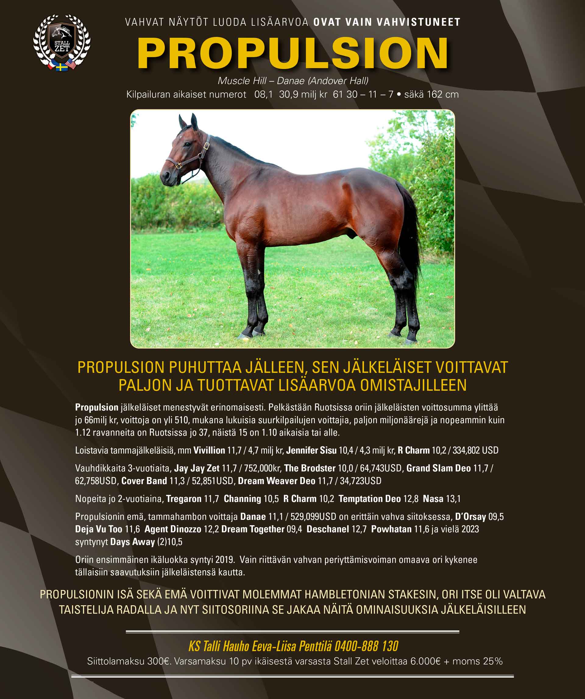 Propulsionin jälkeläiset ovat tienanneet pelkästään Ruotsissa yli 66 milj. kruunua! Se kuuluu Ruotsin isäoritilaston kärkeen vuodesta toiseen!